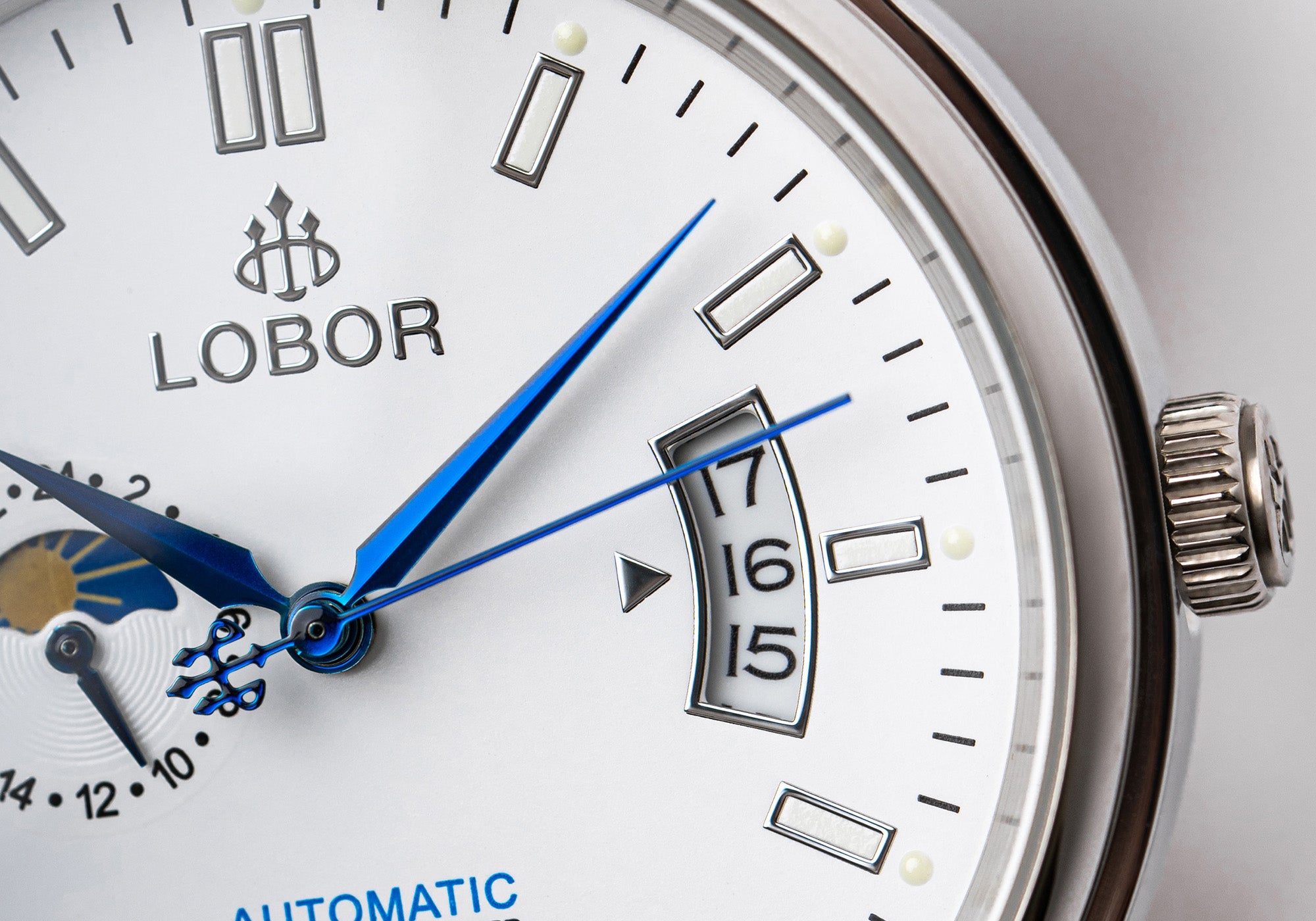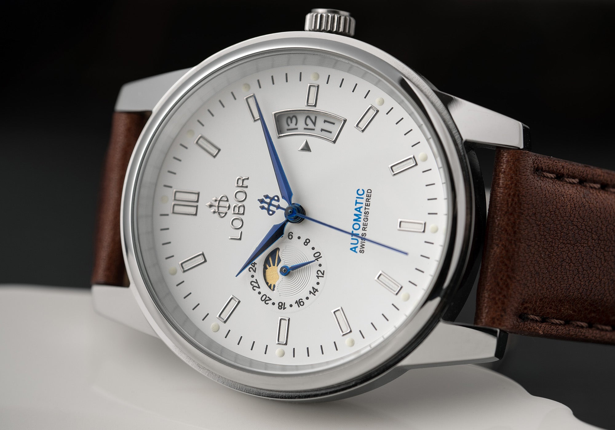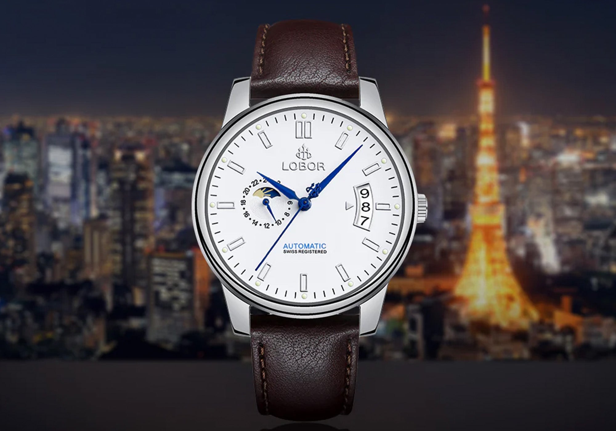 Belfry 配備 24 小時制與日月相顯示盤,結合弧形日期窗與夜光設計,時間資訊一目了然。層次分明的錶盤結構,兼顧功能實用與精緻美感,適合日常與正式場合佩戴。