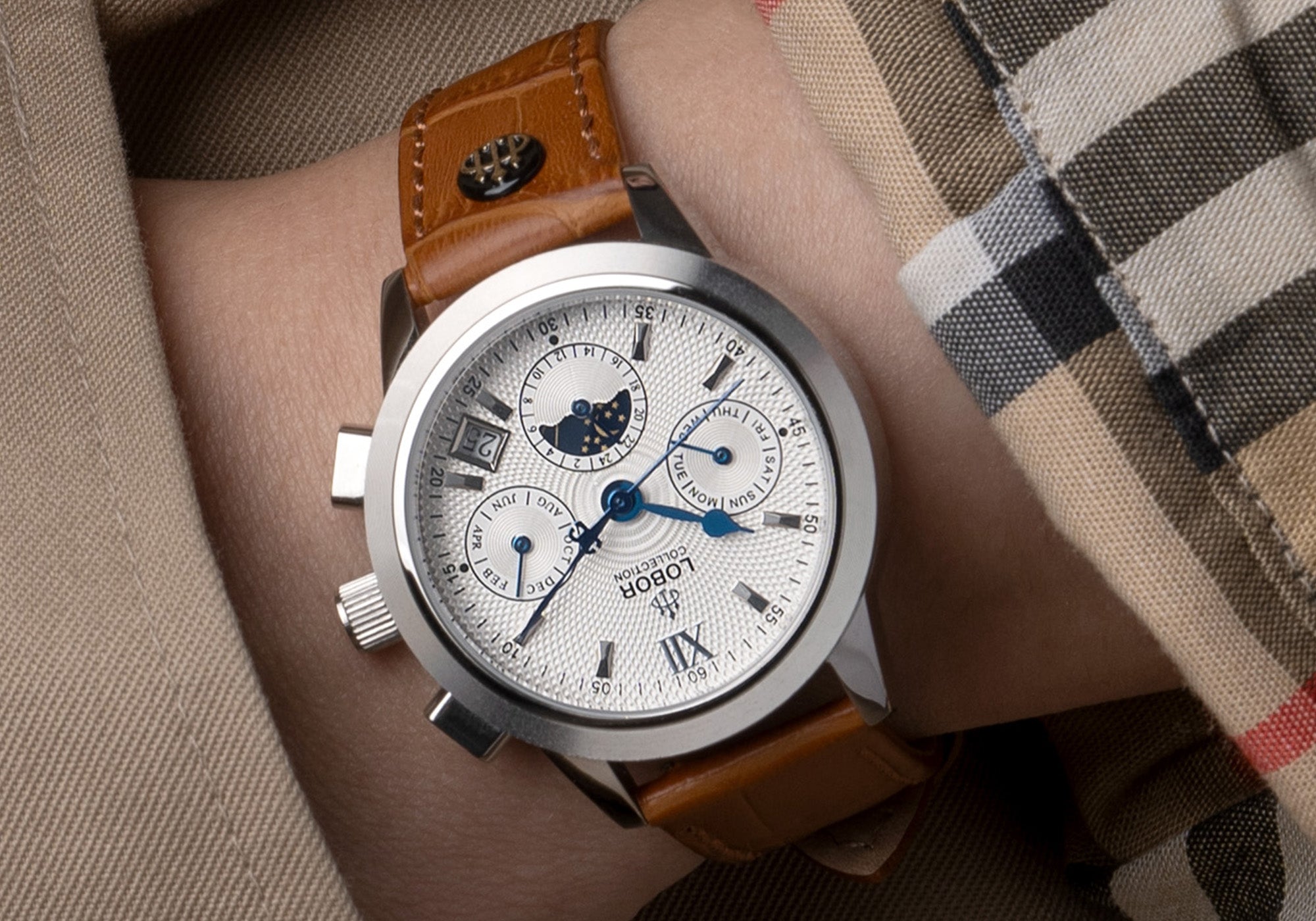 Cellini多功能機械錶系列是當代經典之選,融合永恆優雅的傳統工藝與現代風格。這款機械錶具有精緻的三眼設計,搭載藍色指針,日月相顯示,並支援自動上鏈功能。男女皆宜,Cellini系列將您引領至典雅之境,成為您日常穿搭的精緻點綴。感受LOBOR獨特工藝,揭開Cellini系列的奢華秘密,為您的腕間增添一抹經典之美,是一款值得推薦的手錶。